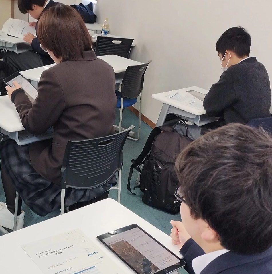 生徒たちは人工衛星による地球観測の仕組みや活用方法について、これまでの授業で学んだ知識と結び付けながら、理解を深めていきました。